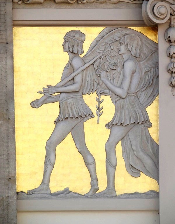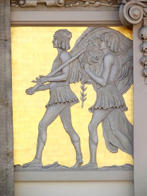 El extraordinario friso diseñado por Jacek Malczewski, con relieves de color gris y fondo dorado, muestra el variado destino del artista.