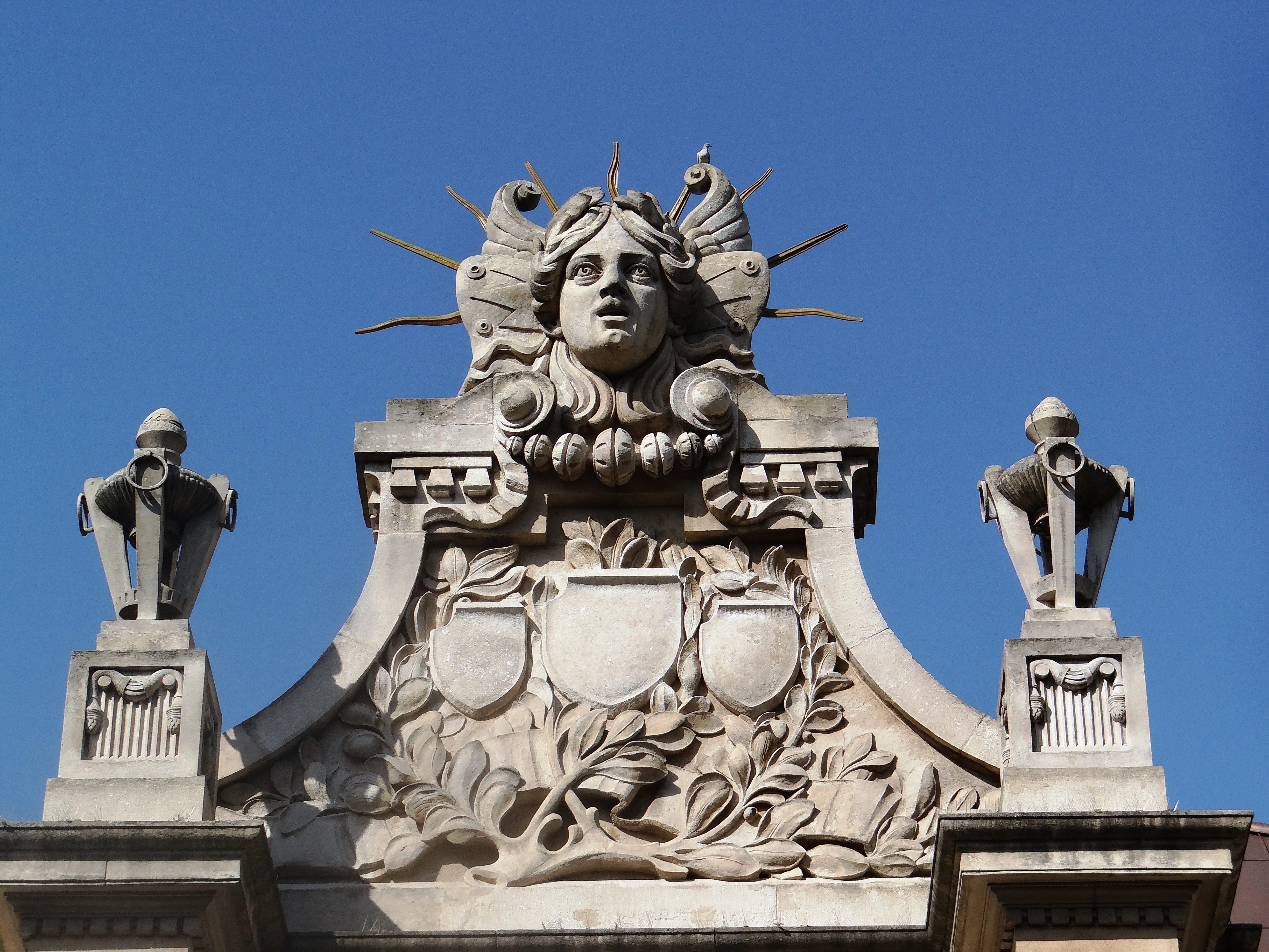 En el exterior, columnas y pilastras jónicas ornamentan el monumental edificio, cuya fachada está coronada por un mascarón de Apolo.
