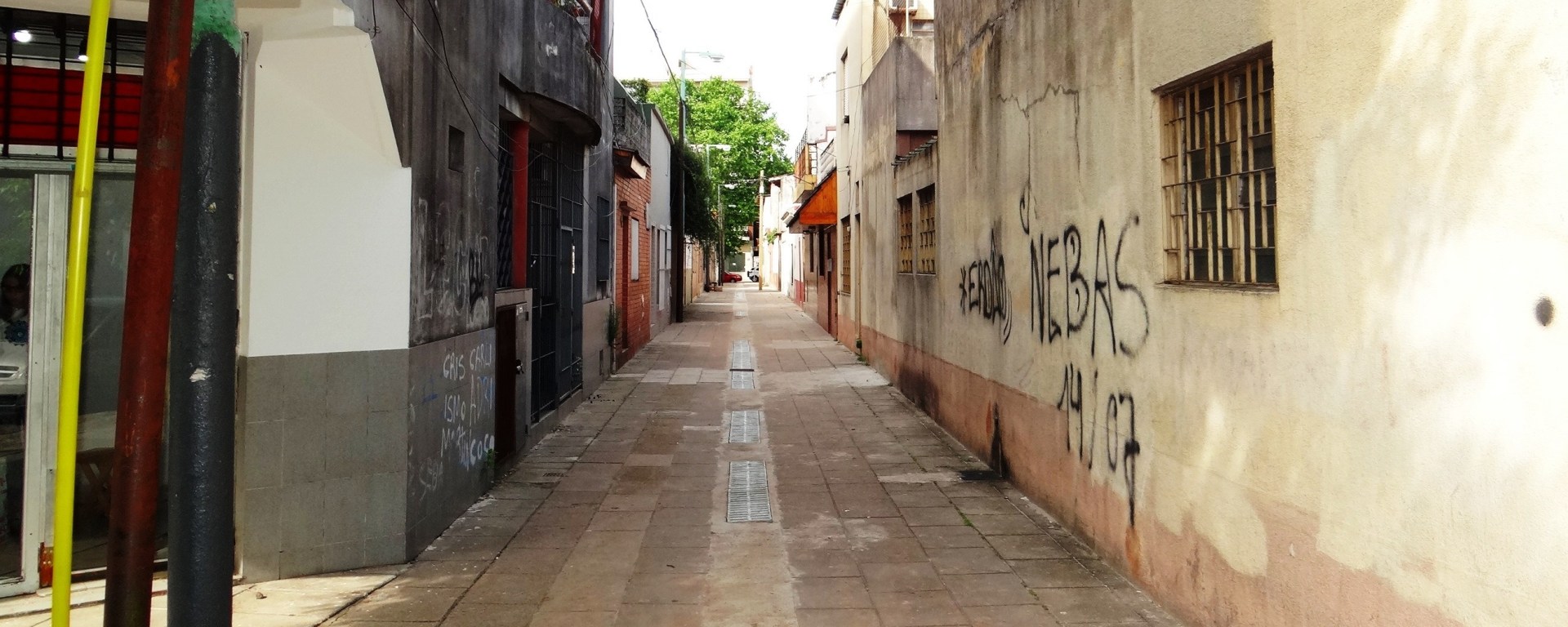 El Pasaje Albania es de casas bajas y sencillas, con muros y paredones que delatan el paso del tiempo. Su senda está cubierta por baldosas, en algunos lugares maltrechas, y largas rejillas de desagüe metálicas que la surcan en una amplia porción de su trayecto. Tiene aroma a barrio, a mate, a vecino y a trabajo.