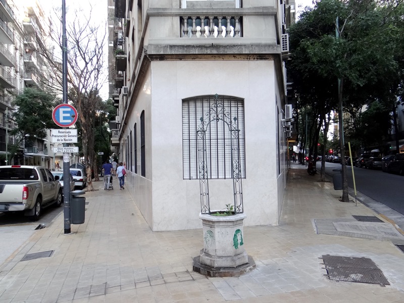 Continuando nuestra marcha por la calle Guido en la misma dirección, encontramos enseguida que la breve calle Parera termina en la mitad de la cuadra derecha. En la esquina siguiente se entrecruzan tres calles: Guido, Montevideo y Uruguay que nace como una diagonal entre las otras dos. Enseguida, la calle Montevideo, al cruzar la calle Juncal hará una curva y se convertirá en paralela de Uruguay. Pero evitemos confusiones y detengámonos en este cruce de múltiples esquinas para observar un aljibe que nace donde se unen Guido y Uruguay. Está ubicado frente a un edificio de siete pisos terminado en 1935 que parece un triángulo trunco, ubicado a la altura de de Guido 1588-98 / Uruguay 1391, obra del arquitecto Carlos Dumas y del ingeniero Alberto Dumas. Se dice que el aljibe es réplica del que la Sociedad Argentina de Escritores (SADE) colocó frente a su sede, en Mexico 526, pero no hay certeza[6].