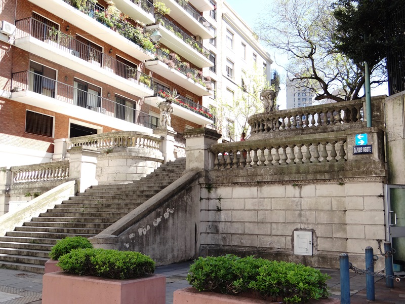 Desde el entrepiso desciende finalmente una amplia escalinata, también de 12 escalones, hasta la calle Agüero, con dos pequeños muros laterales rematados por otros dos canteros.