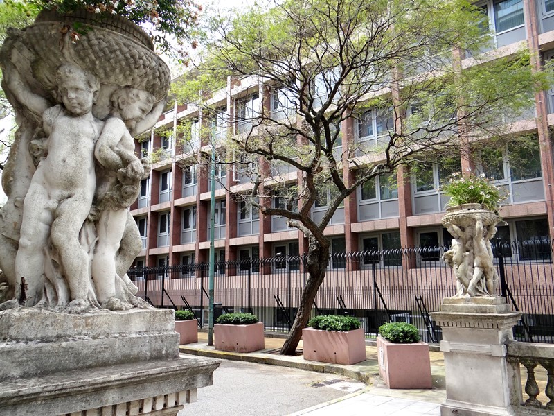 Teniendo a nuestra espalda la escalera que acabamos de ascender, vemos a nuestra derecha un robusto edificio de líneas rectas que parece tener cinco plantas, separado de la calle por una reja. Forma parte del complejo de la Embajada del Reino Unido (conocida popularmente como “Embajada de Inglaterra”).