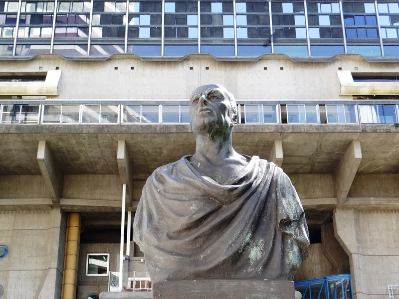 El busto fue inaugurado en 1927[9] y muestra al ilustre galeno con una toga al estilo romano. Se apoya sobre una base de mármol con forma de muro, que a sus lados tiene dos bajorrelieves alegóricos con una cabeza de león entre ambos, de donde fluye el agua hacia la pequeña fuente -que en nuestras visitas siempre hemos visto seca-. Detrás, imponente, se erige como un rectángulo elevado el edificio de la Biblioteca Nacional.