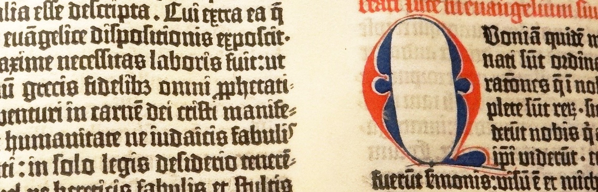 Detalle de la Biblia de Gutenberg correspondiente al Capítulo 1 del Evangelio de Lucas