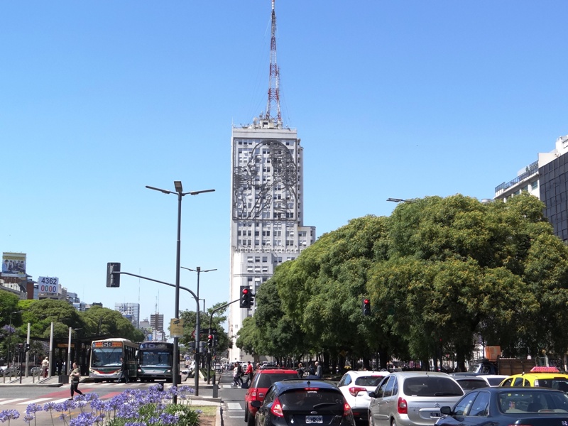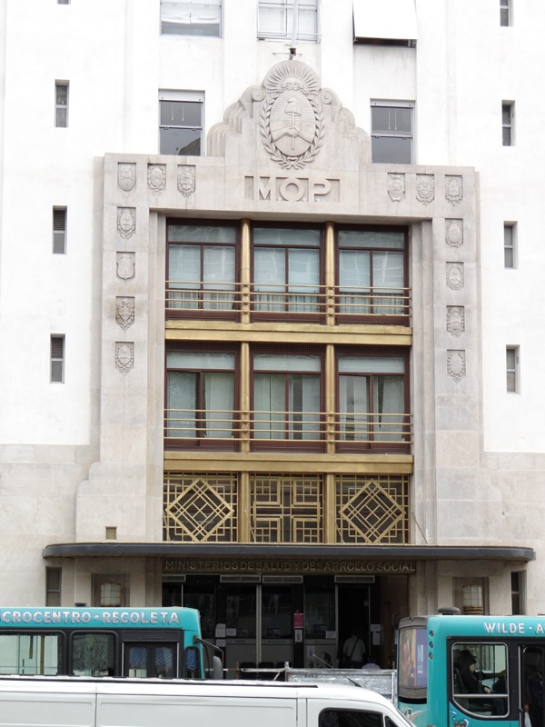Avanzando por la Avenida 9 de Julio de norte a sur uno encuentra una enorme mole hormigonada de líneas rectas y color blancuzco que obliga a desviar el camino. Los turistas se detienen a fotografiar allí un rostro de Evita a gran escala en acero, que de noche se ilumina; además hay una imagen en el mismo estilo del otro lado. El paso incesante de vehículos delata que es el único edificio sobre la “avenida más ancha del mundo”, ubicado en la manzana donde la Avenida Belgrano y la calle Moreno interceptan a la 9 de Julio y a su colectora oeste, la calle Lima. Fue construido como sede del Ministerio de Obras Públicas, por lo que se lo conoce por sus siglas, el “Edificio del MOP”.