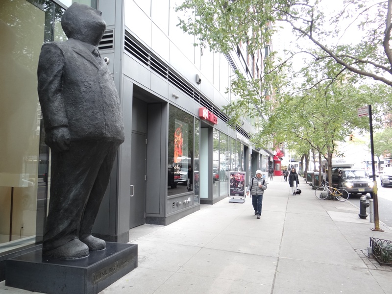 Me dije: la de Brujas es una síntesis de tamaño reducido y la de New York una versión completa en tamaño XL. Pensé “esto debe ser el resultado de una brillante gestión de marketing”… Sin embargo, algo interrumpió mis cavilaciones: debajo de aquel hombre de 12 pies una placa declaraba el nombre de la obra y su autor: delante mío no estaba la gigantografía de “The Visitor” sino “Think Big” de Jim Rennert.