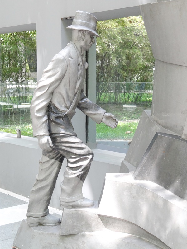 Cuando publicamos la nota en su versión original no sabíamos quién era su autor. Gracias a Gaby Pereyra nos enteramos que la obra se llama «Amores» y es obra del escultor Carlos Affranchino y el escultor y arquitecto Abel Trybiarz. Por su volumen y la calidad de su terminación vale la pena conocerla. Tal vez, por la expresión del hemirostro, y en particular de su boca, y también por la inclinación que le da el cuello, se trata de alguien que sufre. ¿Por qué sufre? Quizás por una lucha interior. Una parte de él, la figura que está arriba, es su pensamiento establecido, mientras que el hombrecito que sube es un pensamiento nuevo, que quiere desplazar o ayudar al otro. La paradoja es que ambos hombres son muy parecidos.