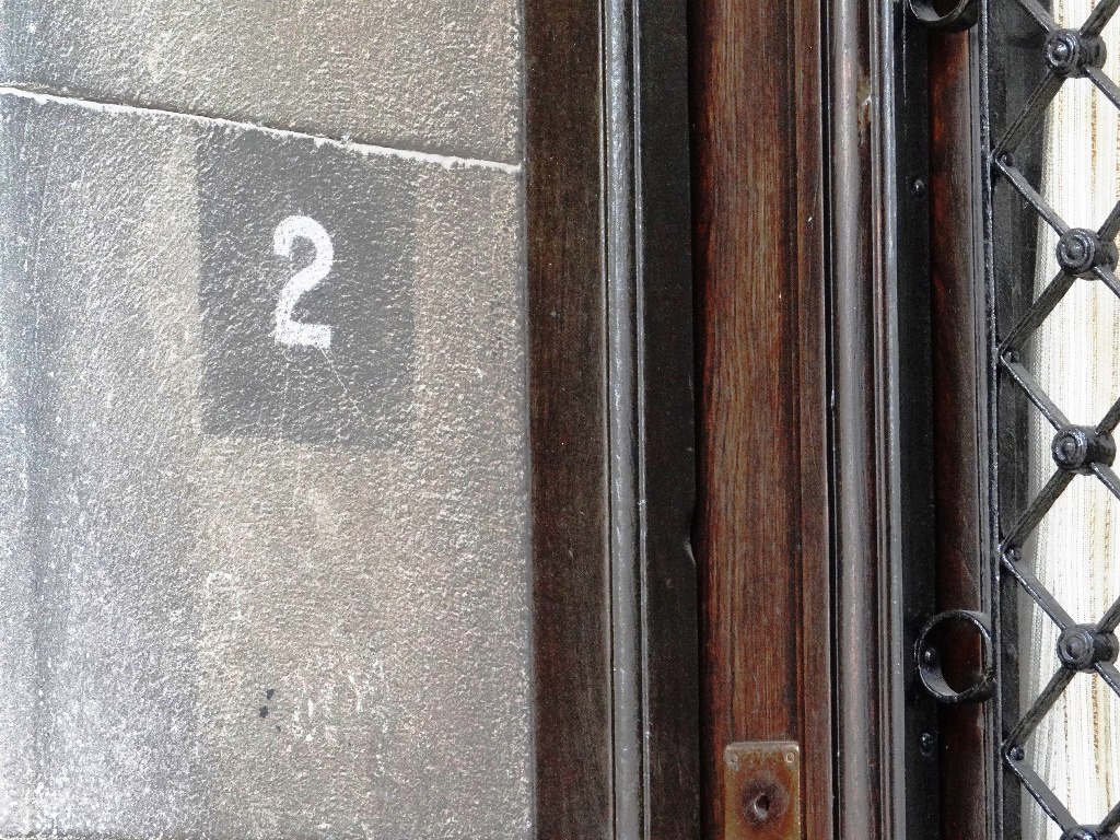 Este edificio de viviendas posee seis puertas en la planta baja, numeradas del 1 al 6, y cuatro balcones en la planta alta.