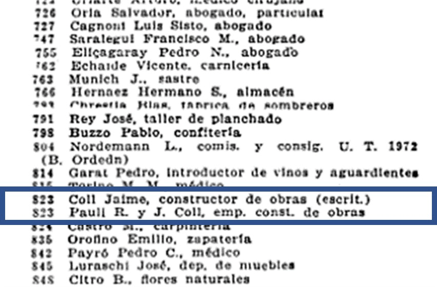 En ningún momento aparece el primer nombre de R. Pauli, pero sí aparece el de Jaime Coll[8], constructor, con la misma dirección de Chacabuco 822[9]. En ese sitio hay actualmente un edificio de departamentos y en el 824/28 una casa antigua sin identificación de sus constructores.