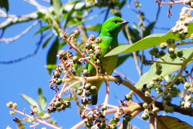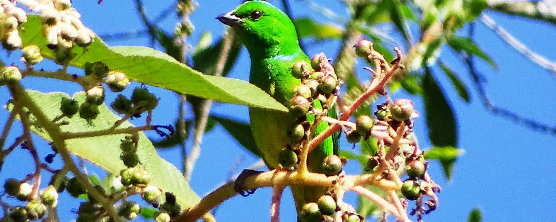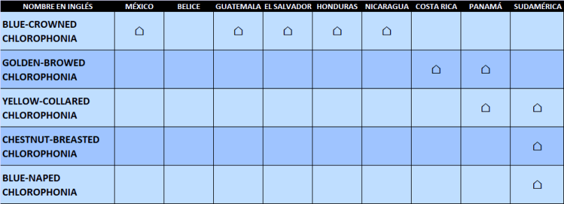 Yellow-collared Chlorophonia (nombre científico Chlorophonia flavirostris; en español clorofonia acollarada) desde Panamá (donde es muy difícil de ver; en eBird solo hay 41 registros de los cuales solo 5 tienen fotografías que documenten la especie) hasta Ecuador siguiendo la línea del Océano Pacífico.
