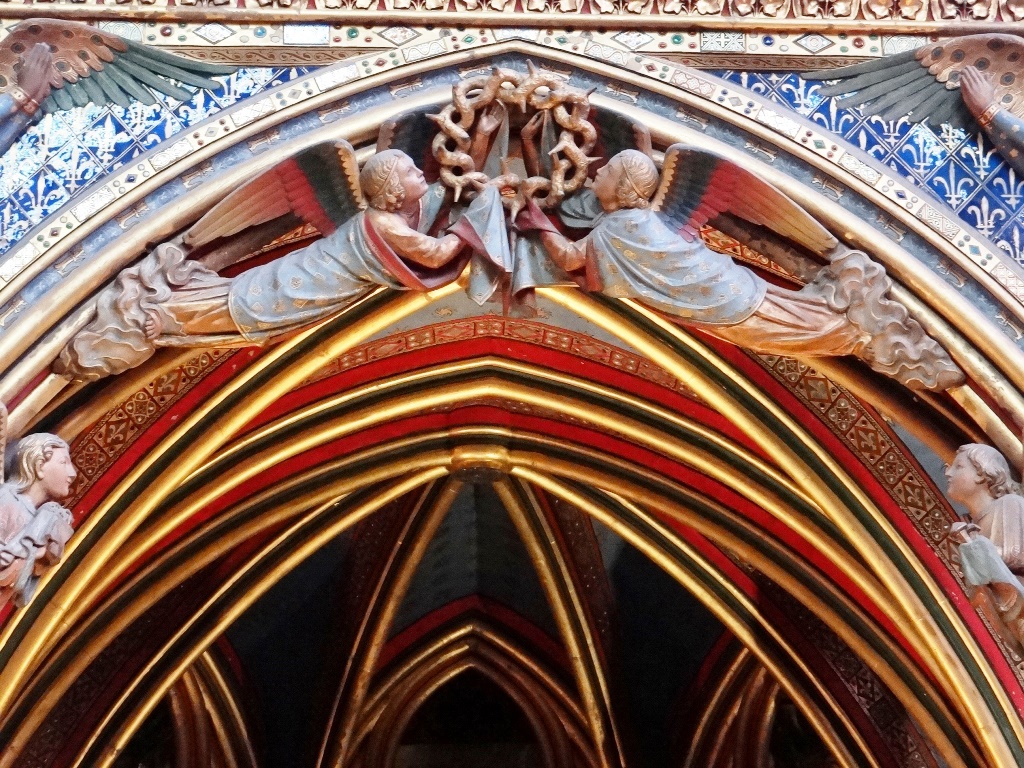 Sus 15 vidrieras contienen 1.113 escenas, donde se integran los personajes bíblicos con la realeza incluyendo al propio Luis IX llevando la corona de espinas.
