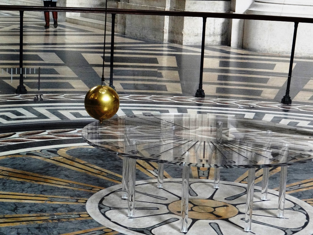 En su centro se encuentra un enorme Péndulo de Foucault, una esfera que oscila libremente, utilizado para demostrar la rotación de la Tierra.