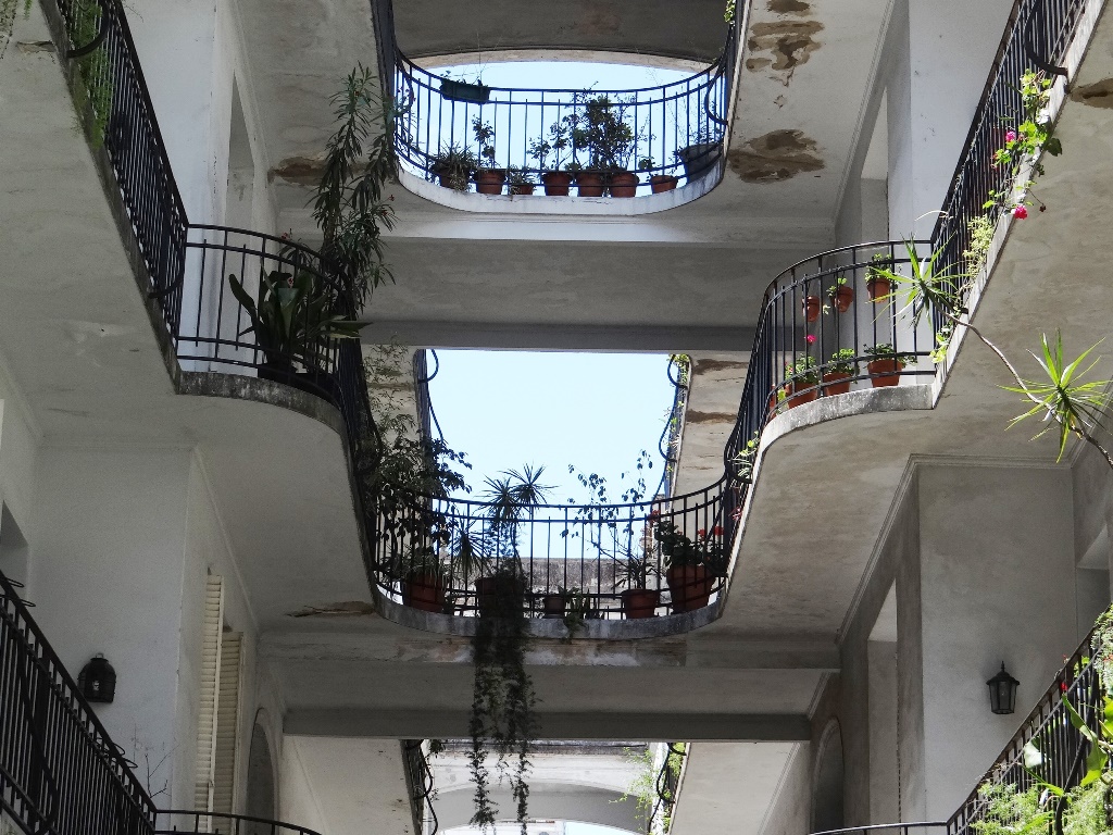 Tanto en el centro del pasaje como en los cuerpos lindantes hay macetas con plantas ornamentales; también otras caen delicadamente desde los balcones.