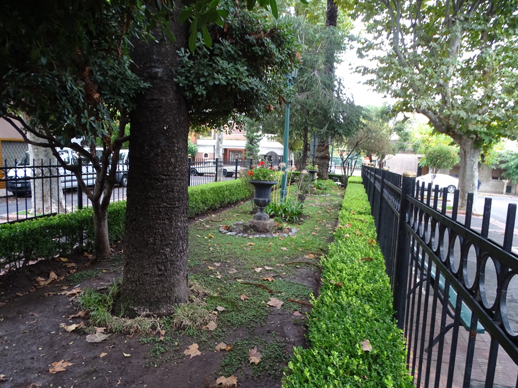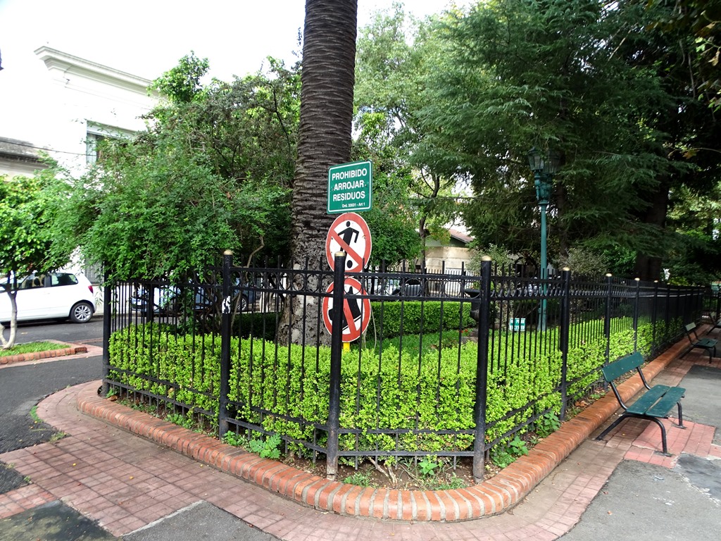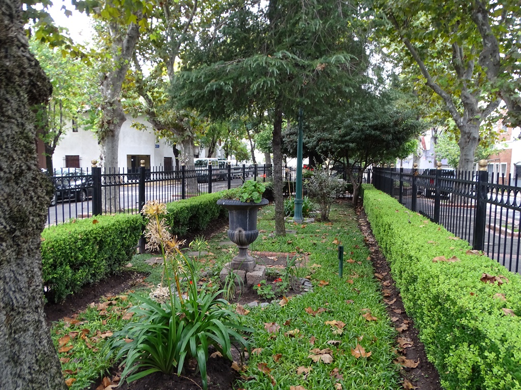La plazoleta ocupa dos angostas manzanas. Sus jardines están protegidos por una cerca de hierro negra y dentro de ellos se encuentran dos grandes palmeras y dos araucarias, junto a plátanos y palos borrachos rodeados por una cuidad ligustrina.