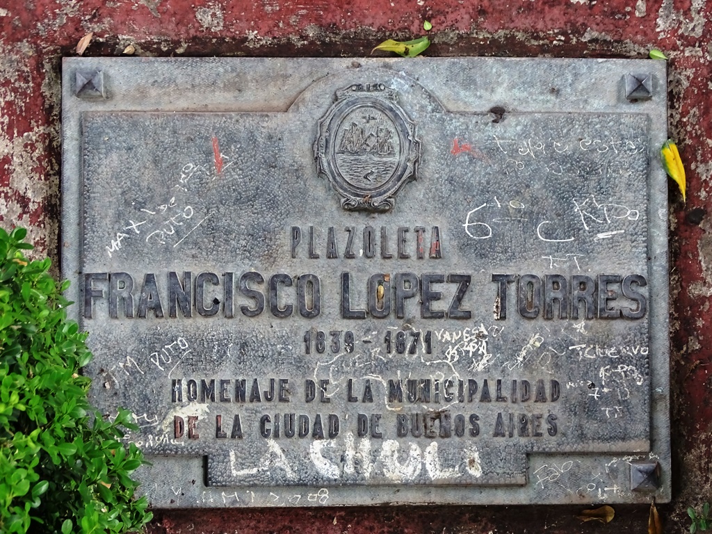 Una placa recuerda a Francisco López Torres (1839-1871), periodista, escritor y político, que peleó en la Guerra del Paraguay, fue ministro de gobierno de la provincia de Mendoza y murió durante la epidemia de fiebre amarilla.