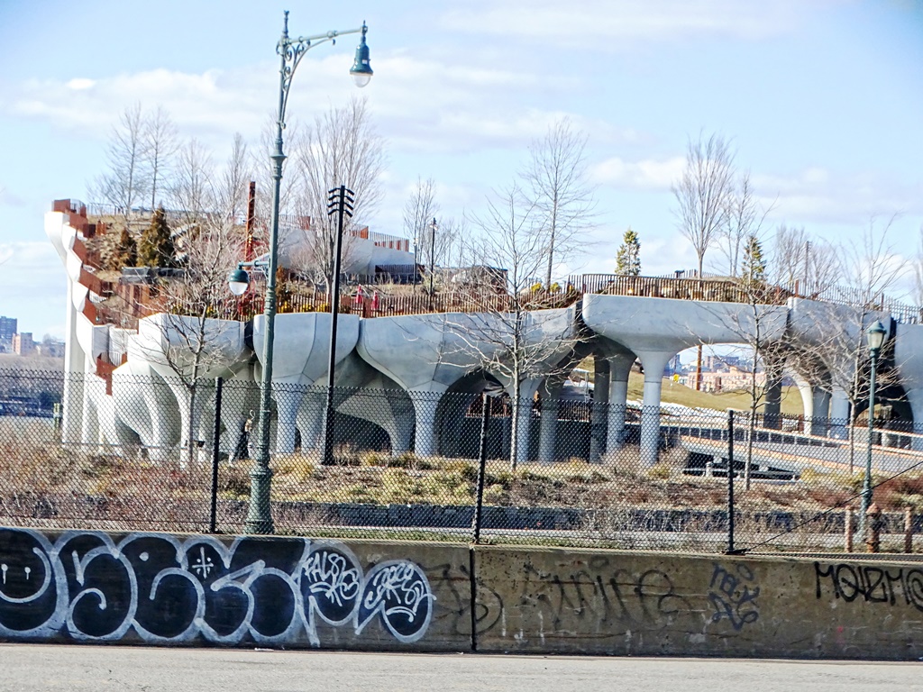 Aunque no lo hemos podido recorrer y solo lo hemos visto desde afuera, este original espacio abierto parece una isla flotante sobre pilotes que entra sobre el río Hudson.