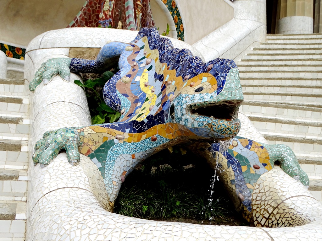 Justo encima de una de las fuentes, entre ambas mangas de la escalera principal se encuentra el famoso dragón, hoy símbolo de Barcelona, revestido con trencadís, que también decora los asientos del ex teatro griego.