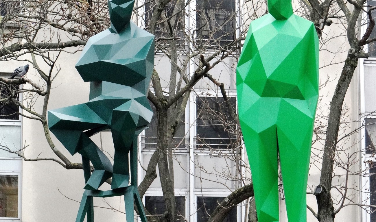 Son dos imponentes figuras de acero inoxidables que descansan sobre bases de color verde. La figura de sentada y tonalidad oscura corresponde a Renzo Piano; la figura de pie y del mismo color de los soportes corresponde a Richard Rogers.