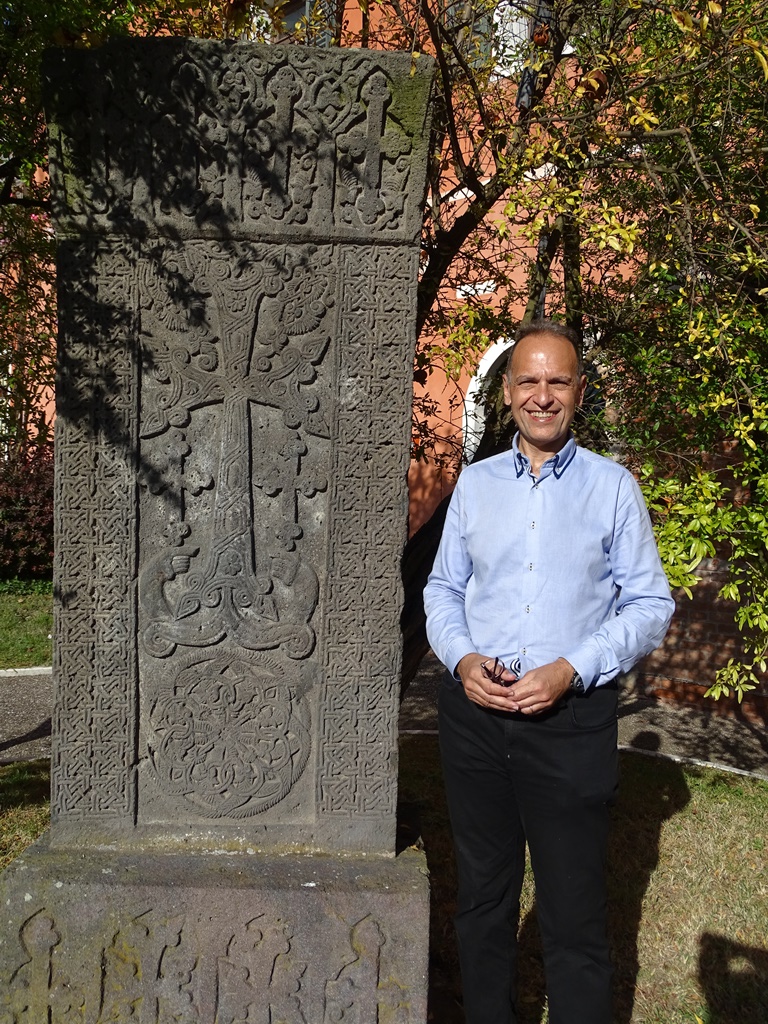 A la fecha de escribir este artículo, visitamos cuatro veces Venecia, la primera en 1999. La isla estaba siendo restaurada y no se permitían las visitas, así que nos conformamos con visitar el Colegio Moorat-Raphael donde fuimos atendidos muy amablemente por su director. Hemos estado en San Lazzaro en 2004, 2019 y 2022. Compartimos foto de 2019 junto a la jachkar que se encuentra en el parque exterior que da a la laguna.