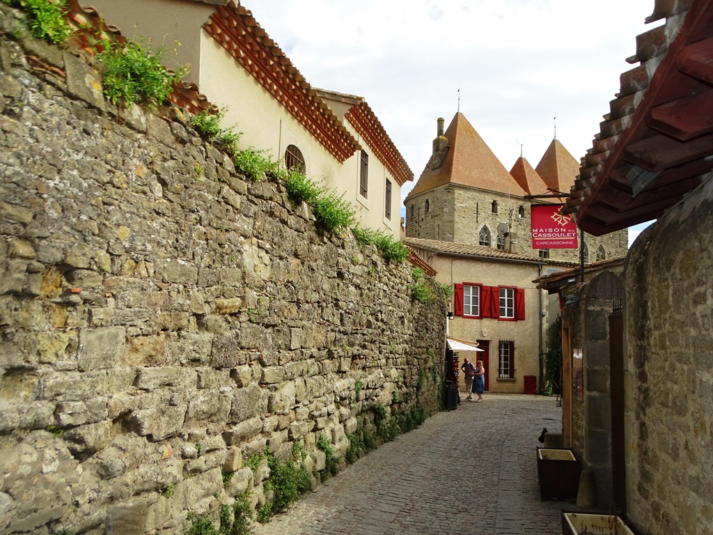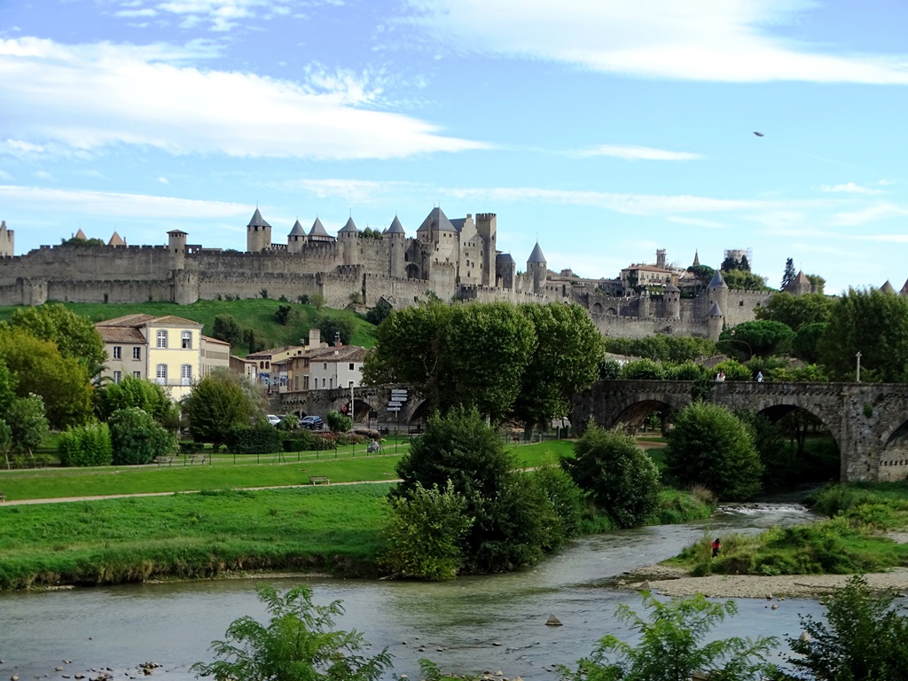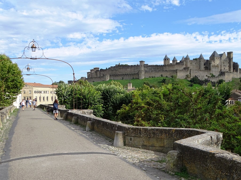 Del otro lado, cruzando el Aude por el Puente Viejo (un puente peatonal del siglo XIV), se encuentran tiendas, restaurantes al aire libre y coloridas viviendas que ofrecen un ámbito más alegre e informal. Ascendiendo por estrechas callejuelas se llega a la ciudadela amurallada (para los locales, La Cité), un complejo arquitectónico medieval restaurado por Viollet-le-Duc en el siglo XIX e inscrita en el Patrimonio Mundial de la UNESCO desde 1997.