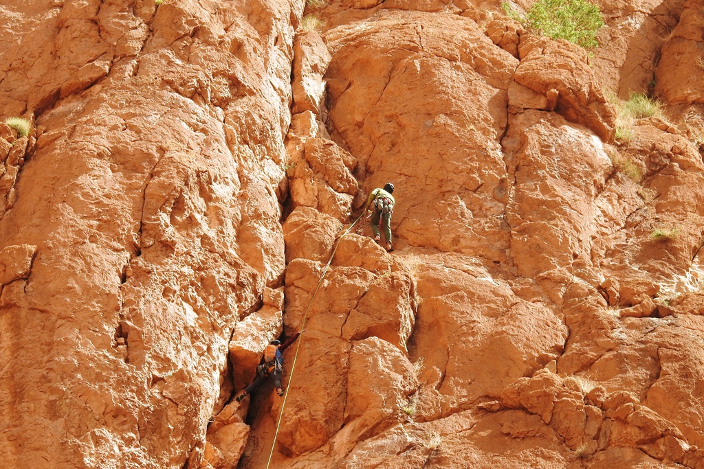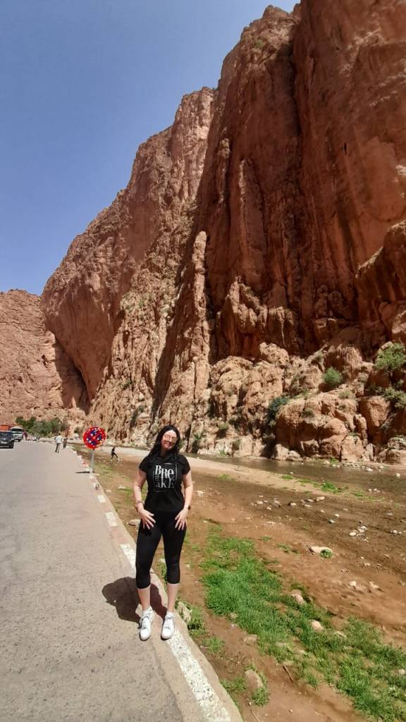 Nuestra primera parada es en la Garganta del Todra, un cañón de roca escarpado debajo del cual corre el río. Nos cautiva la imponente pared de piedra erigida sobre nosotros.