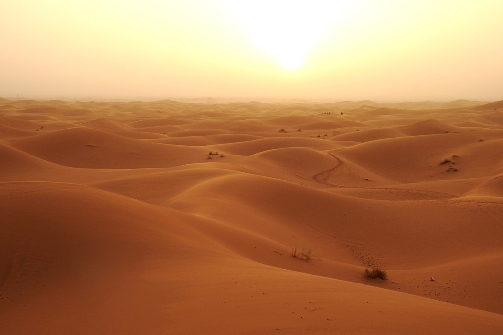 Pasamos allí el resto de la tarde. Llegan cabalgando unas jóvenes europeas junto a su guía; nos cuentan que han decidido cruzar el desierto a caballo; se hospedan también en el riad. Están cubiertas de polvo. Solo hay algunos arbustos esparcidos en ese mar de polvo, unos pocos cerros de piedra y los médanos desde los cuales observamos el atardecer.
