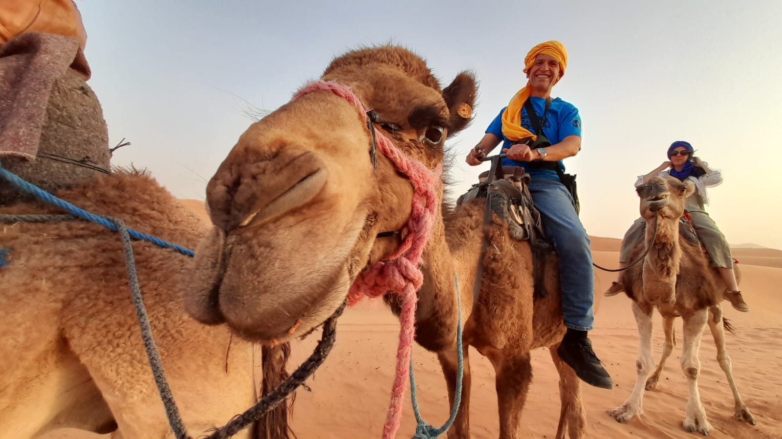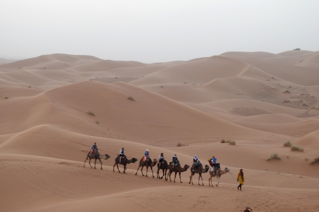 Luego de un corto trayecto, el conductor se detiene. Dialoga con un bereber[5] a cargo de una manada de camellos (en realidad, dromedarios). Llegan a un acuerdo. Descendemos para iniciar la travesía. Los animales se sientan en la arena para que los viajeros subamos sobre ellos. Nos tomamos fuerte del extremo superior de la montura mientras se levantan. Iniciamos lentamente la marcha. Formamos una fila conducida por un guía que va a pie.