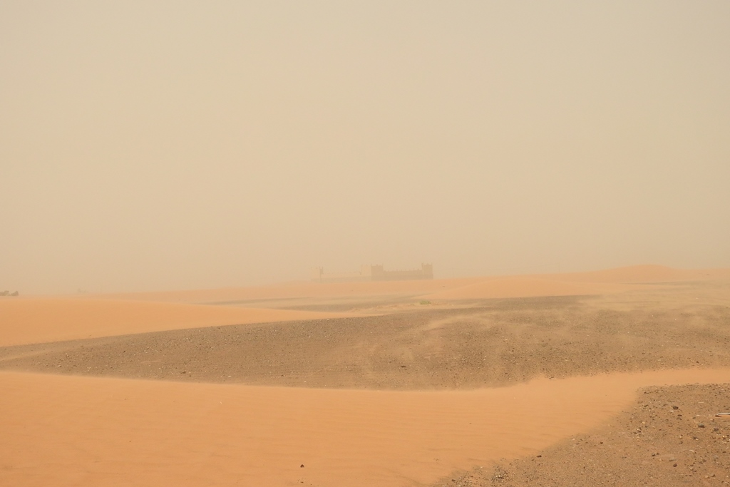Nos despierta la luz matinal. Al asomarnos fuera de las tiendas, notamos algo extraño en el ambiente. “Ha comenzado una tormenta de arena”, nos dicen. Apuramos la salida porque todo repentinamente se va volviendo oscuro. El cielo toma un color café.  Apenas se divisa el camino, pues la ventisca de arena es intensa, pero nuestro guía y chofer conoce bien el terreno.