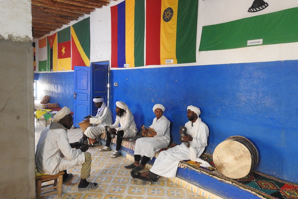 Nos detenemos brevemente en un pueblo de la tribu Gnawa o Gnaoua. Allí inmigrantes de diversas regiones de África se ganan la vida haciendo música.