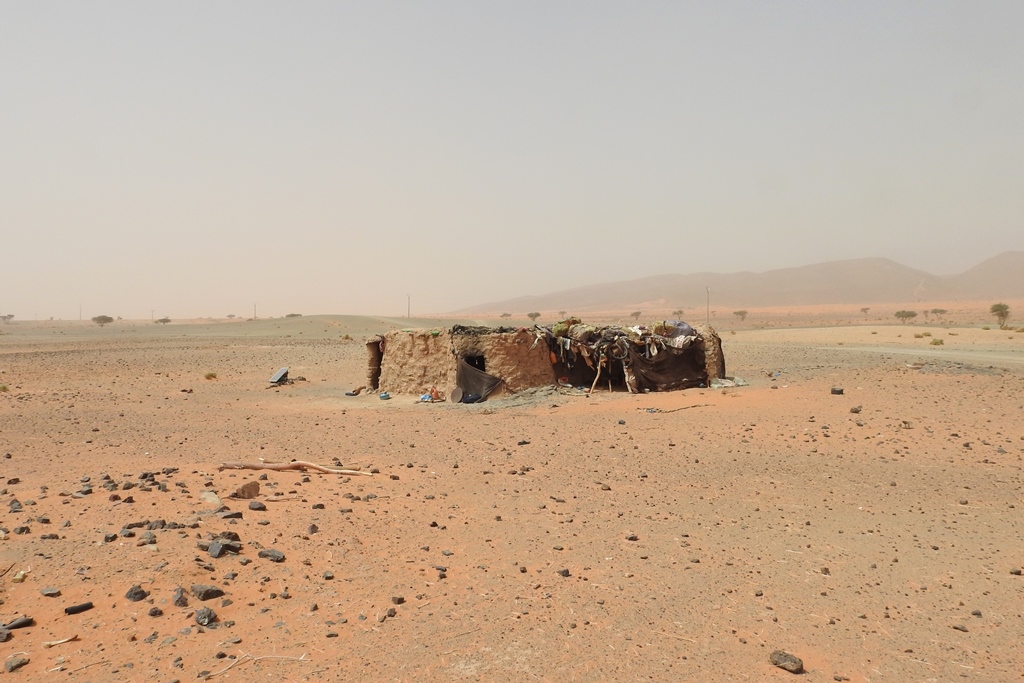 Rompiendo la monotonía del paisaje, Observamos la precaria vivienda de una familia nómade bereber.