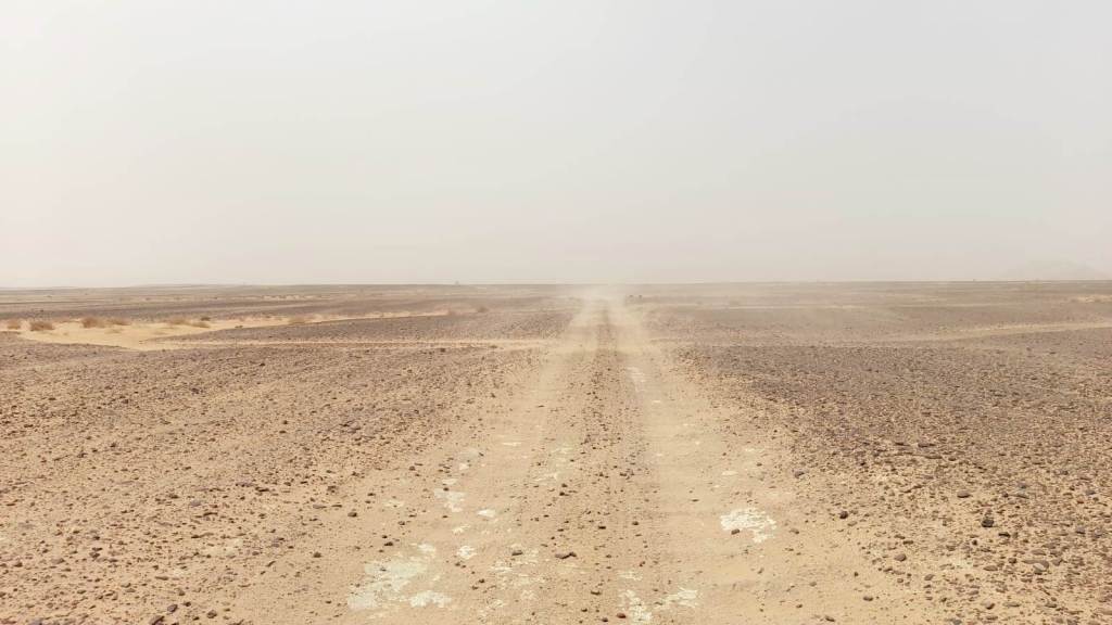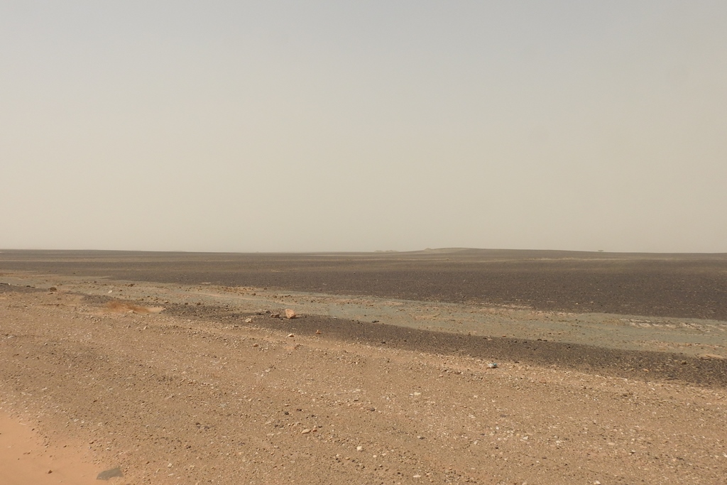 No nos atrae y decidimos seguir. La ruta es durísima. Todo es piedra, sin otra vista. La tormenta de arena se aleja. La meseta que se extiende hasta el horizonte es plana y rígida.