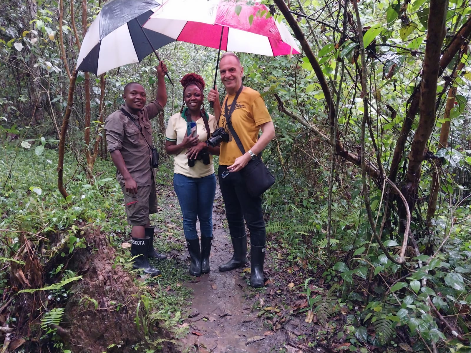 Para observarlos es necesario entrar a la jungla y abrirse paso a filo de machete en medio de subidas y bajadas, sobre un piso barroso cubierto de una espesa vegetación. Delante nuestro iba un guía y dos personas armadas con AK 47 (nos decían que ante la repentina aparición de animales salvajes, como elefantes del bosque, los utilizan para espantarlos mediante disparos al aire) mientras dos avezados rangers realizaban la búsqueda.