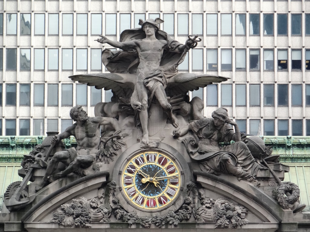 En su frente se destaca un grupo escultórico llamado “La gloria del comercio” con las figuras mitológicas de Mercurio, Minerva y Hércules junto a un reloj de cristales Tiffany. La fachada fue diseñada por el arquitecto Whitney Warren y, el grupo de estatuas esculpido por Jules-Alexis Coutain.