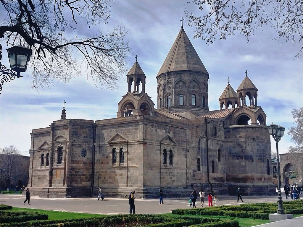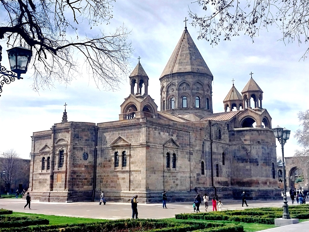 El edificio más importante lo constituye la Catedral de Echmiadzin. Se lo considera el templo cristiano más antiguo del país pues su construcción original data del año 303, dos años después que la nación adoptara el cristianismo como religión oficial. Reconstruido a fines del siglo V ha padecido, como suele suceder con las grandes iglesias en Europa, numerosas reformas que impiden reconocer su fisonomía original. Solo los muros sur y oeste datan del siglo IV. Sin embargo, sigue los típicos lineamientos de la arquitectura religiosa armenia, con su cúpula central octogonal y dos más pequeñas a ambos lados.