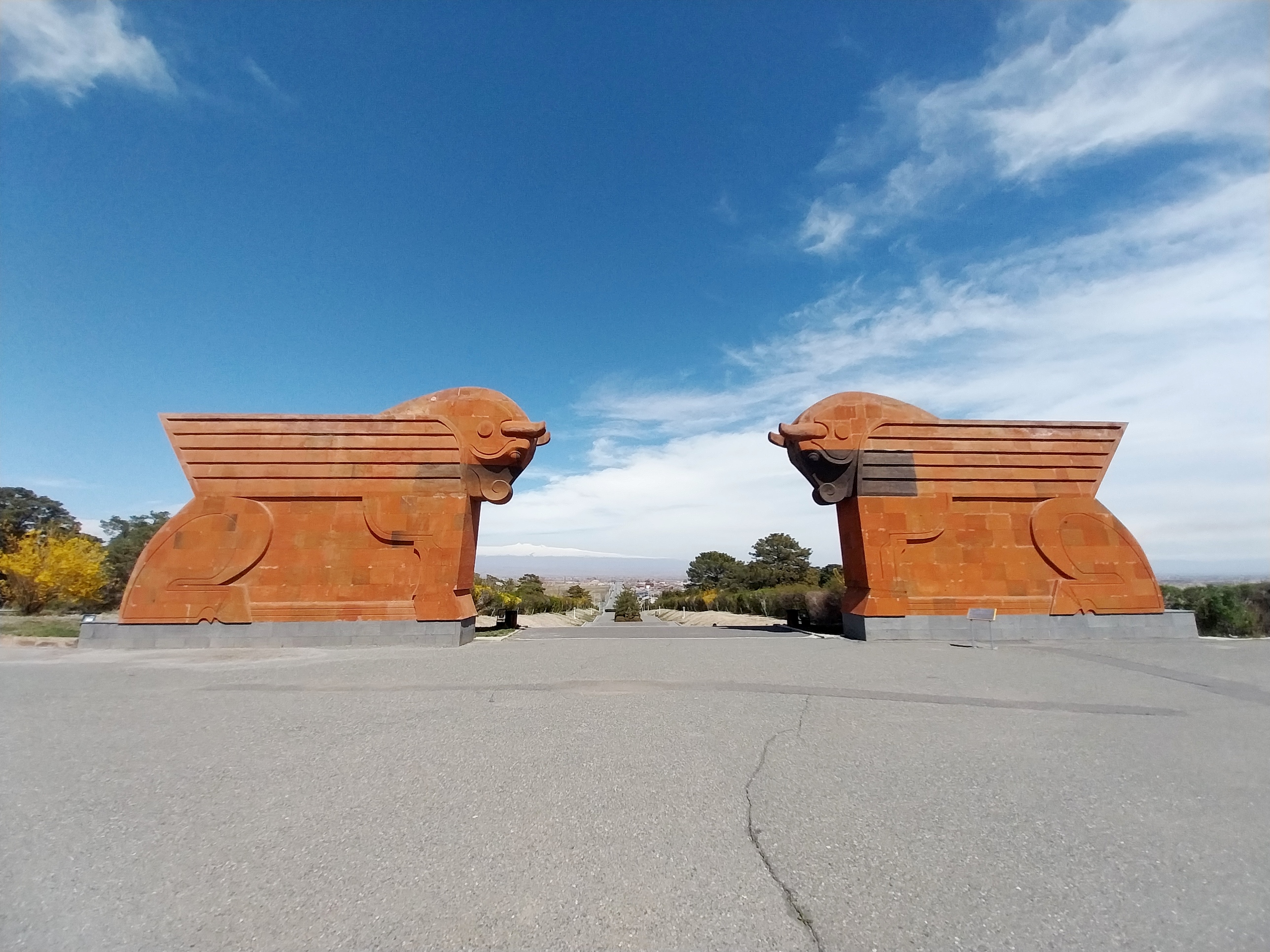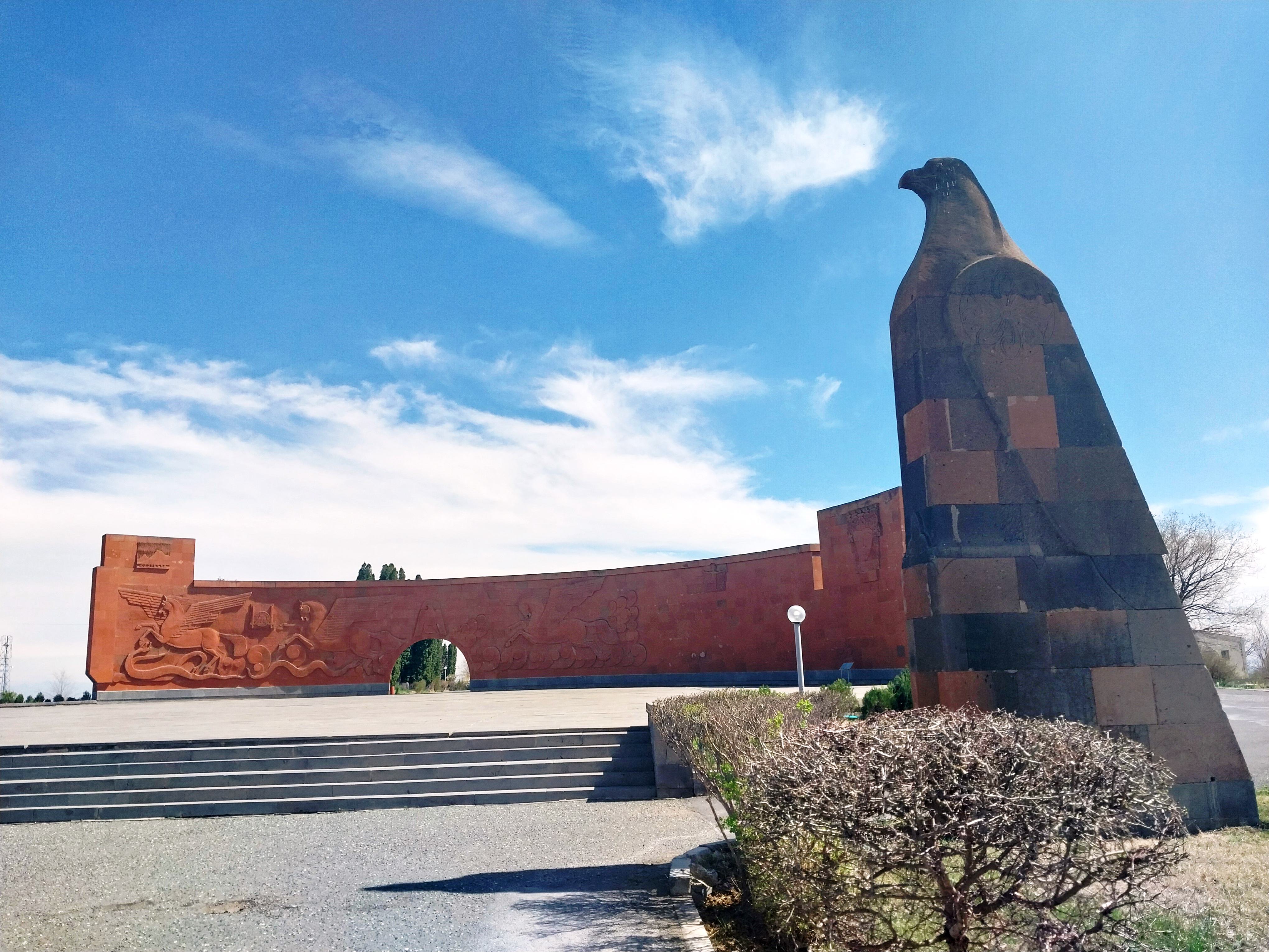 A la izquierda, flanqueada por águilas de piedra de 6 metros de altura se abre una avenida que conduce al Muro de la Victoria, que luce bajorrelieves que representan la épica batalla y el renacimiento de Armenia. El monumento fue inaugurado en 1968.