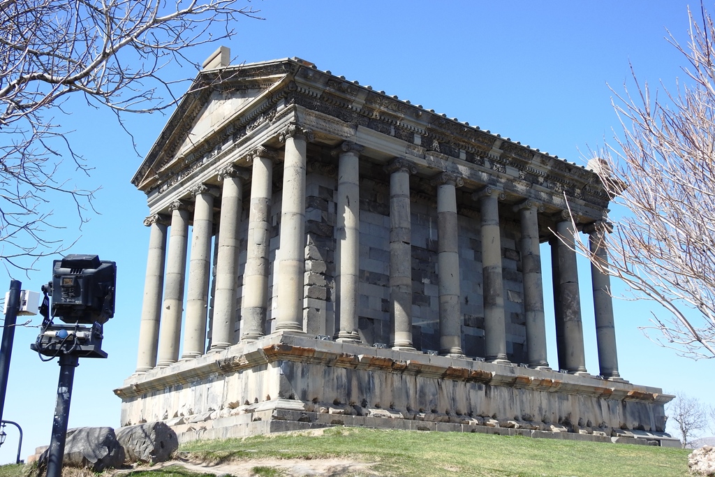 Se trata de la construcción precristiana mejor conservada de Armenia. Se atribuye al rey Trdates I, quien lo dedicó a MIhr, el dios sol. El diseño sigue la arquitectura clásica griega con un exterior rodeado por 24 columnas decoradas con capiteles jónicos y un techo a dos aguas con un frontón triangular.