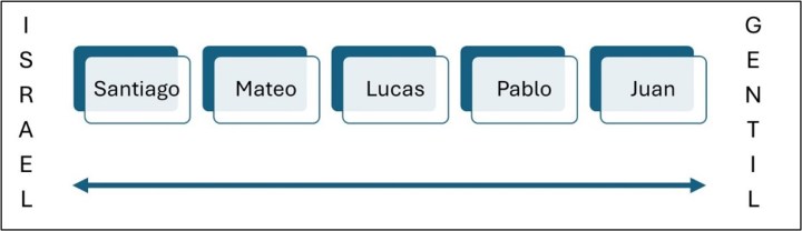 Alguna vez encontramos -creemos que en una obra de Oscar Cullmann- un esquema que posiciona las tendencias de las distintas tendencias de autores de evangelios y cartas de acuerdo a su afinidad con la Ley judía e Israel y el mundo gentil o pagano. Lo reproducimos tal cual lo recordamos: