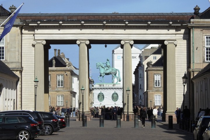 Caminando unos pocos metros llegamos a Amaliegade, la calle que nos conduce directamente al palacio. En ella está emplazada un arco plano con una columnata neoclásica con capiteles jónicos que forma parte del conjunto arquitectónico del palacio.