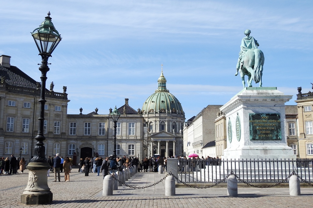 Desde la Iglesia de Mármol caminamos un corto trecho para llegar al Amalienborg Slot, la residencia de invierno de la familia real danesa. Diseñado por el arquitecto Nicolai Eigtved, fue levantado para la nobleza entre 1750 y 1768, convirtiéndose en sede oficial de la monarquía recién en 1794.