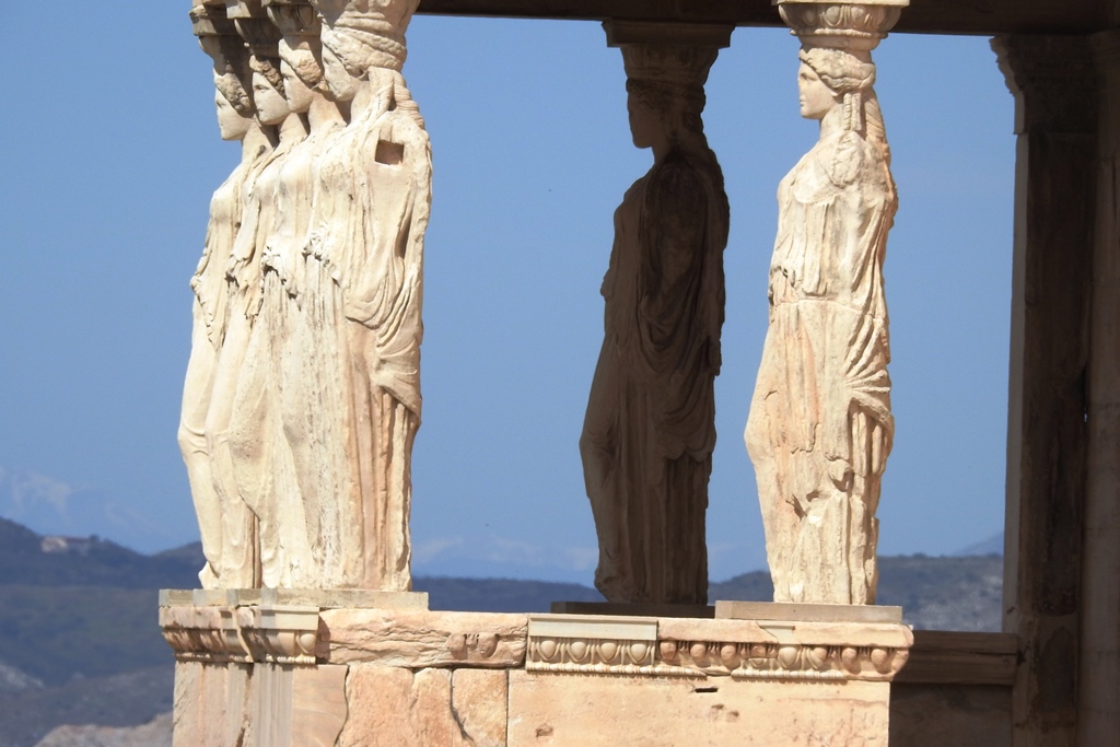 Las seis esculturas que admiramos en la Acrópolis son copias, pues las originales en 1979 se retiraron para preservarlas de las inclemencias del tiempo. Una se había perdido mucho antes, pues fue desmontada del Erecteón y transportada a Inglaterra en 1804. Hoy, como buena parte de los frisos del Partenón, esa estatua se expone en el Museo Británico de Londres. Las otras cinco se exponen en el Museo de la Acrópolis.