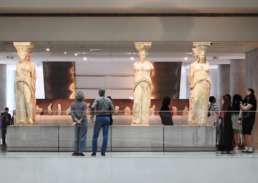Las seis esculturas que admiramos en la Acrópolis son copias, pues las originales en 1979 se retiraron para preservarlas de las inclemencias del tiempo. Una se había perdido mucho antes, pues fue desmontada del Erecteón y transportada a Inglaterra en 1804. Hoy, como buena parte de los frisos del Partenón, esa estatua se expone en el Museo Británico de Londres. Las otras cinco se exponen en el Museo de la Acrópolis.