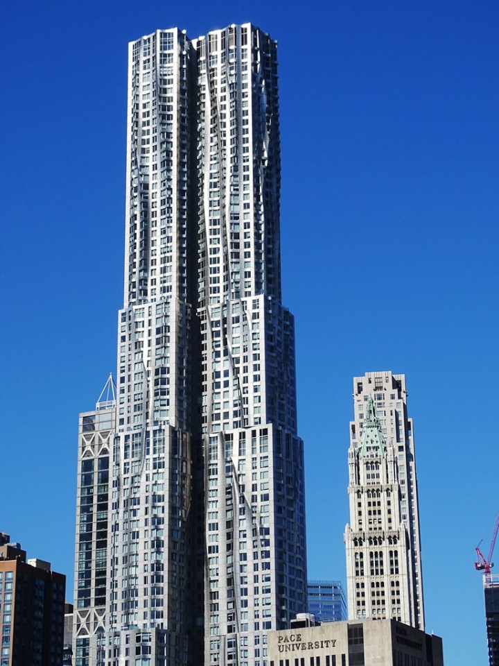 Pocos arquitectos dividen las aguas como Frank Gehry[5]: o se lo admira con pasión o produce una terrible urticaria. Sus diseños han roto todos los moldes y han extendido los límites de lo posible. Una de sus obras más interesantes es la Torre Beekman erigida en Nueva York en 2011[6].