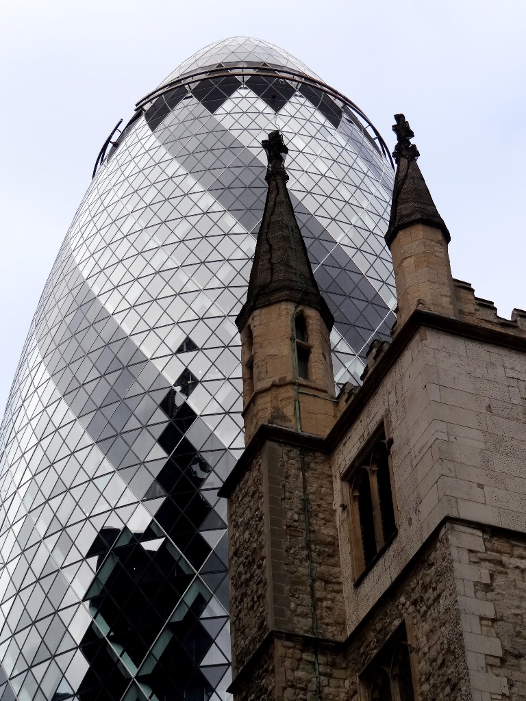 Originalmente denominado Swiss Re Building, este extraordinario edificio está ubicado cerca de la Torre de Londres y es creación del genial Norman Foster[3]. Cuenta con 40 plantas y 180 metros de altura. Parece sacado de una película futurista. Aunque se lo conoce como The Gherkin (El Pepinillo), su diseño nos recuerda a un cohete, un misil o a una bala.