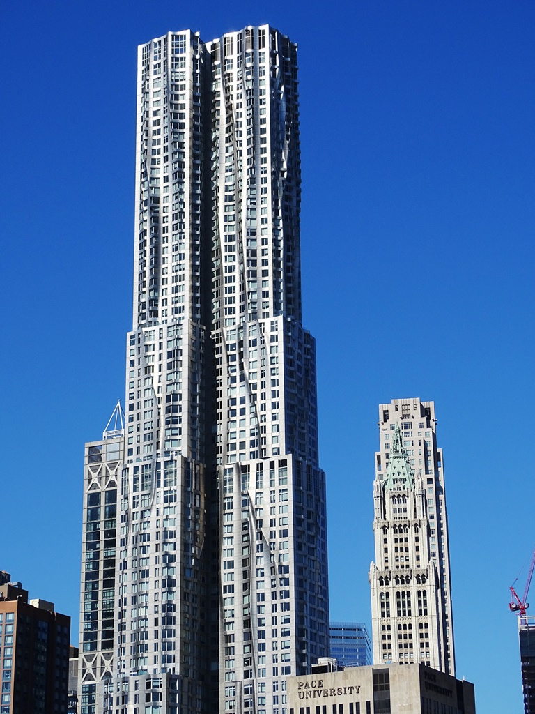 Pocos arquitectos dividen las aguas como Frank Gehry[5]: o se lo admira con pasión o produce una terrible urticaria. Sus diseños han roto todos los moldes y han extendido los límites de lo posible. Una de sus obras más interesantes es la Torre Beekman erigida en Nueva York en 2011[6].