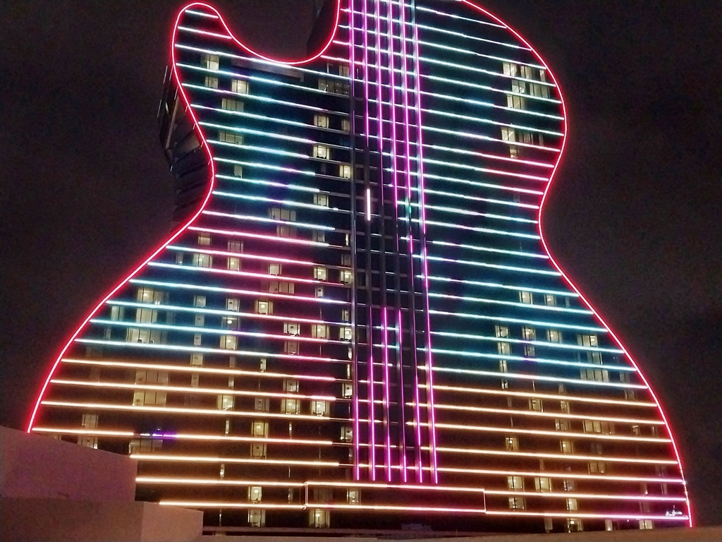 Este espléndido hotel, casino y centro comercial se encuentra en Hollywood, no en la localidad famosa por sus estudios de cine sino en una ciudad del mismo nombre ubicada en la Florida, muy cerca e Miami. El nombre correcto es The Guitar Hotel at Seminole Hard Rock Hotel & Casino Hollywood.